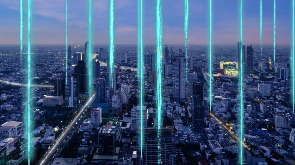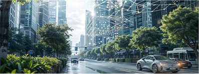Dispositivos IoT, sensores, câmeras e mobiliário urbano inteligente conectam a cidade em uma rede que coleta e analisa dados em tempo real, permitindo uma gestão urbana eficiente.